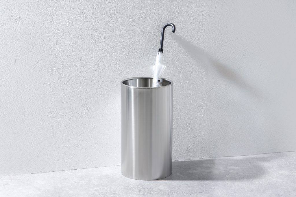 丈夫なステンレス製で安定性の高い、シンプルで使いやすい円筒型傘立てです。